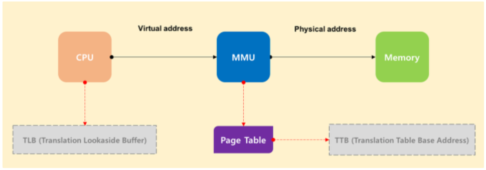 - MMU (Memory Management Unit)는 page table을 참조하여 CPU 가 요청한 virtual address를 physical address로 translation을 하여 메모리에 접근한다.